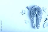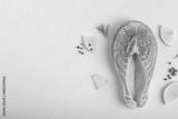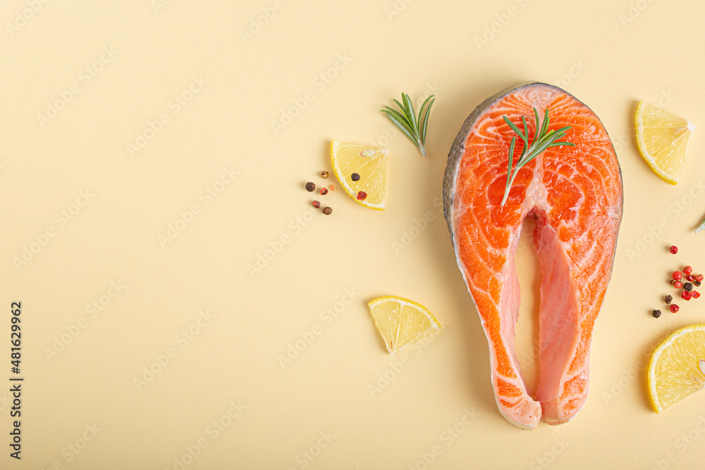 Uncooked raw fresh fish salmon steak top view on beige pastel background with rosemary, lemon wedges and spices, delicacy healthy fish cooking and nutrition concept flat lay space for text