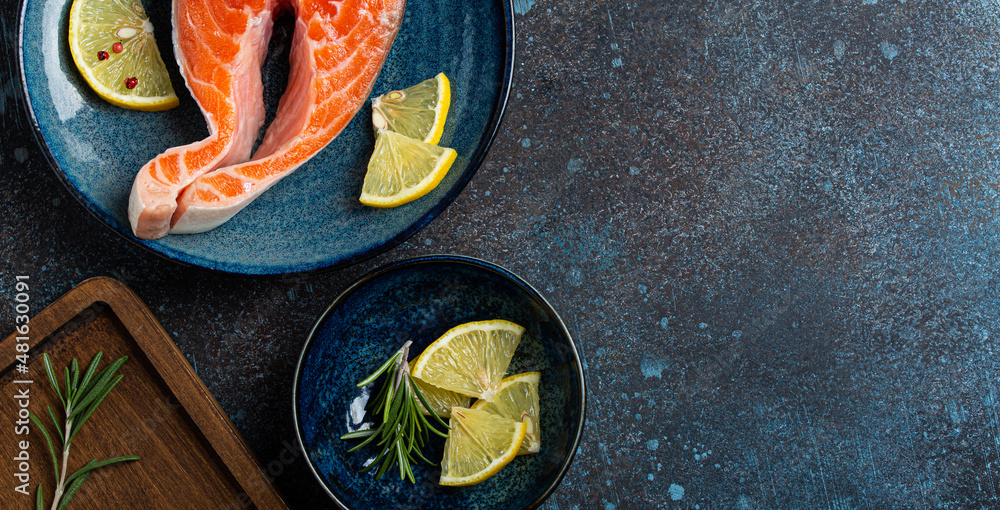 Uncooked raw fresh fish salmon steak top view on plate rustic dark concrete stone background with rosemary, lemon wedges and spices, delicacy healthy fish cooking and nutrition concept space for text