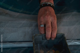 Homeless hand with small basket with coin on the street. Beggar begging for money. Poor man sit on bed in winter beside the street. Poverty and social problems. Poor and sad man need money and help.