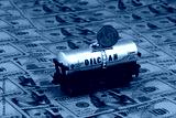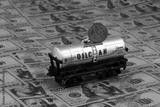 A toy tank for transporting petroleum products of the children's railroad stands on $ 100 bills
