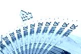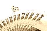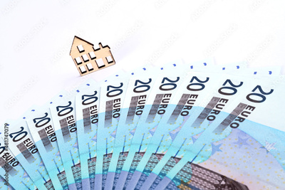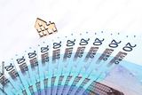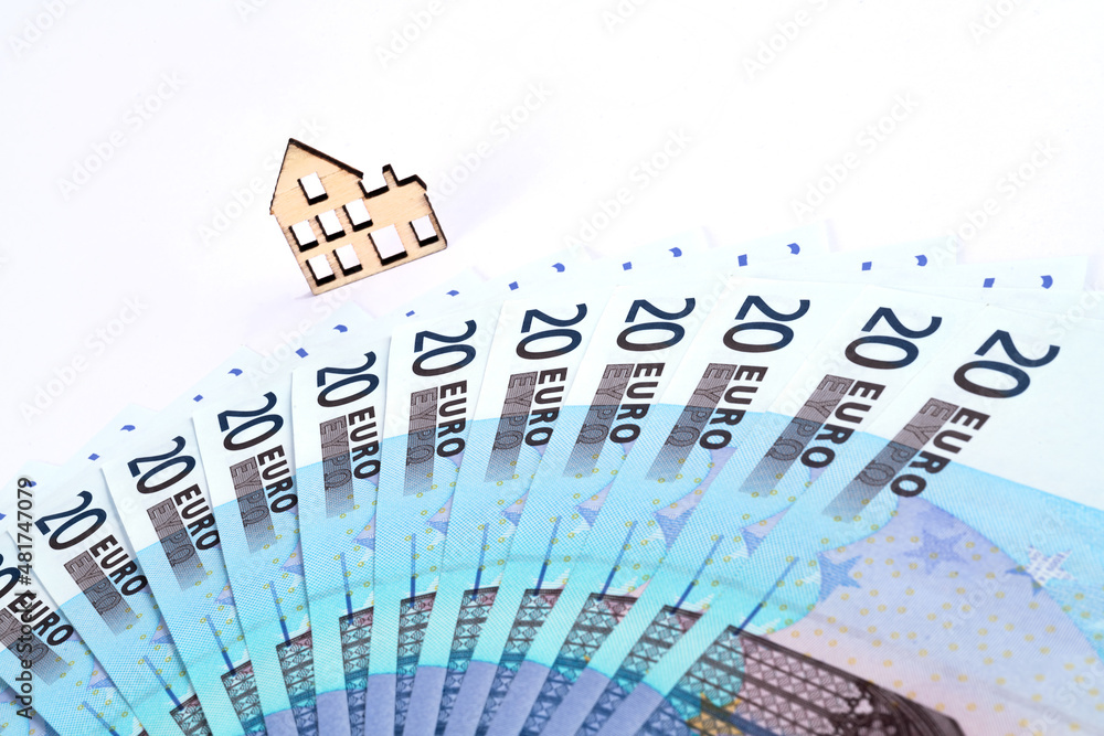 Small wooden toy house and fanned 20 euro bills on white background