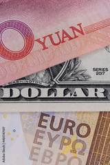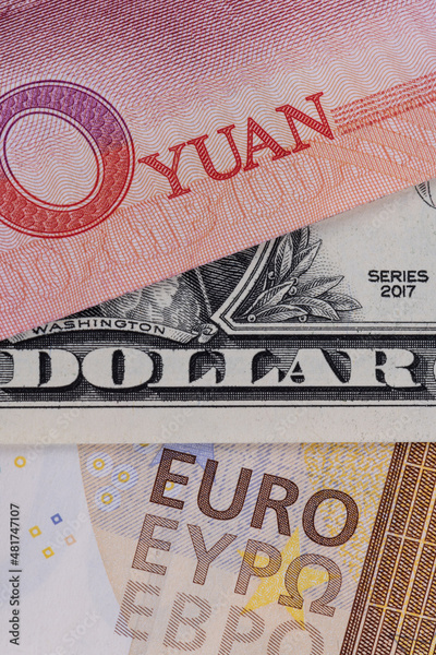Fragments of 100 yuan, 100 USD and 200 euro bills