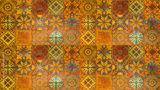 Colorful abstract orange yellow red vintage retro geometric square retro mosaic motif tiles texture background