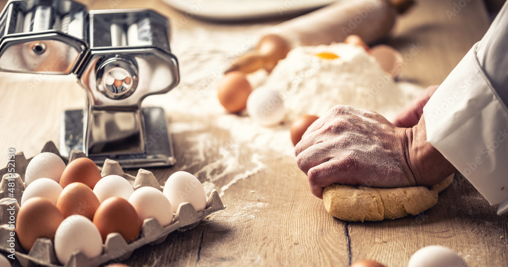 Italian chef making fresh dough for pasta next to eggs, flour and a pasta maker