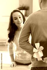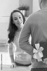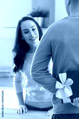 Woman is trying to guess a gift behind her man's back as he holds a candy box to surprise her