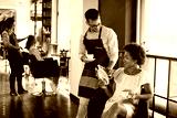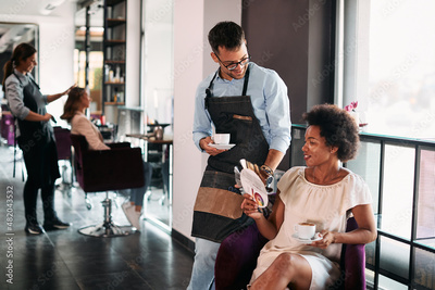 Male hairstylist and his African American female client talk about hair colors while drinking coffee at the salon.