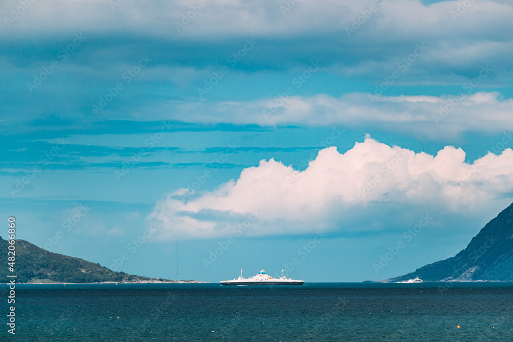 Svinegjerdsvika, More og Romsdal, Norway. Modern Ship Floating Near Harbour. Svinegjerdsvika, More og Romsdal, Norway. Modern Ship Floating Near Harbour.