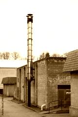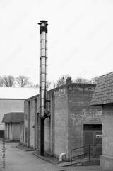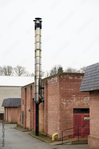 Flue chimney fixed to building exterior wall stainless steel from exhaust boiler plant room