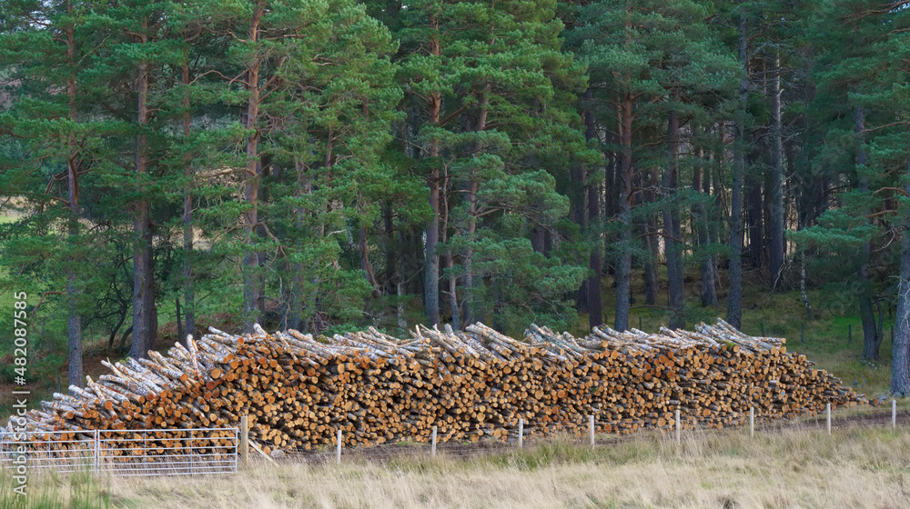 Chopped wood logs for sale use in fire place at home stored on forest woods green biomass energy