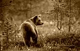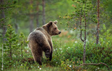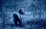 Brown bear in the summer forest at sunrise. Scientific name: Ursus arctos. Wild nature. Natural habitat..