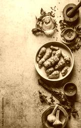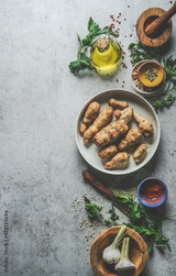 Jerusalem artichoke in bowl on grey concrete table with kitchen utensils and ingredients. Cooking at home with healthy ingredients. Top view.