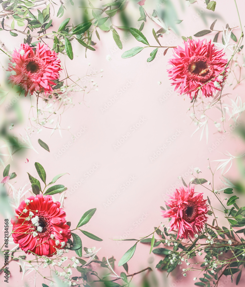 Floral frame with green leaves and pink gerbera glowers at pink background. Top view with copy space.