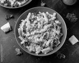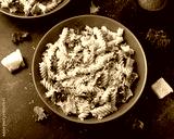 Fusilli pasta with bacon, kale and parmesan cheese. Healthy food