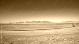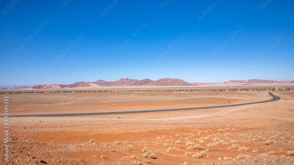 Humpy paved road to Sossusvlei in Namib desert, Namibia, Africa with some dry bushes and trees as well as dunes and mountains in background.