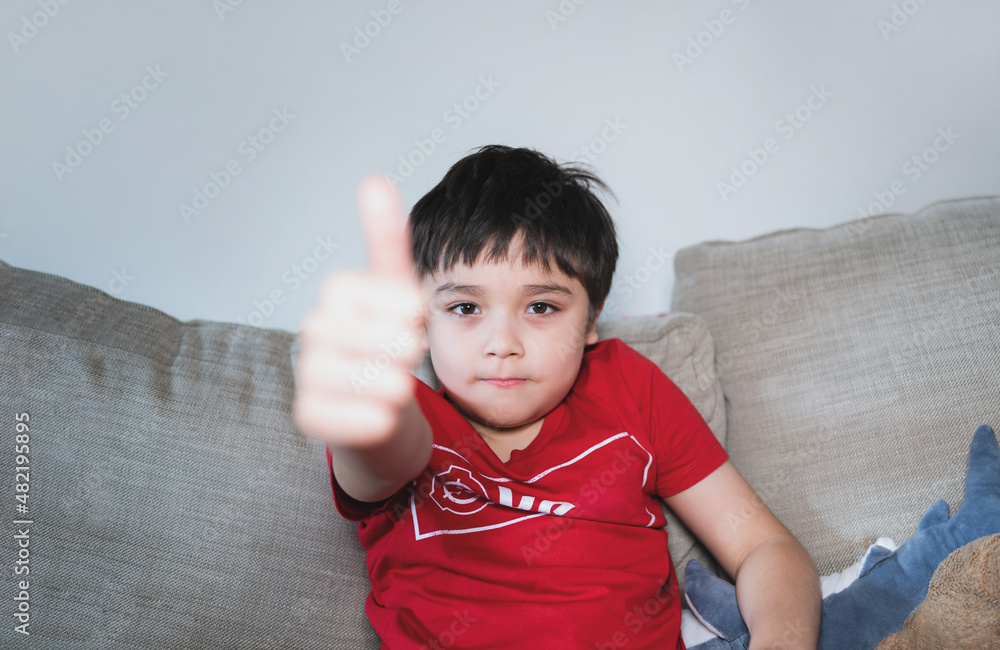 Young happy cheerful Child boy with red T- Shirt showing thumb up, School kid showing OK sign and looking at Camera, Selective focus on face.