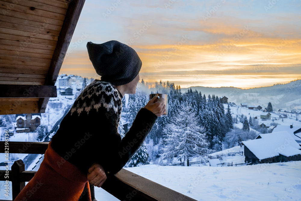 Young woman drinknig coffee or tea with a view of the winter mountain landscape