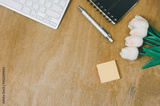 Top view flat lay notebook and flower and pen with keyboard computer on wood table.Copy space
