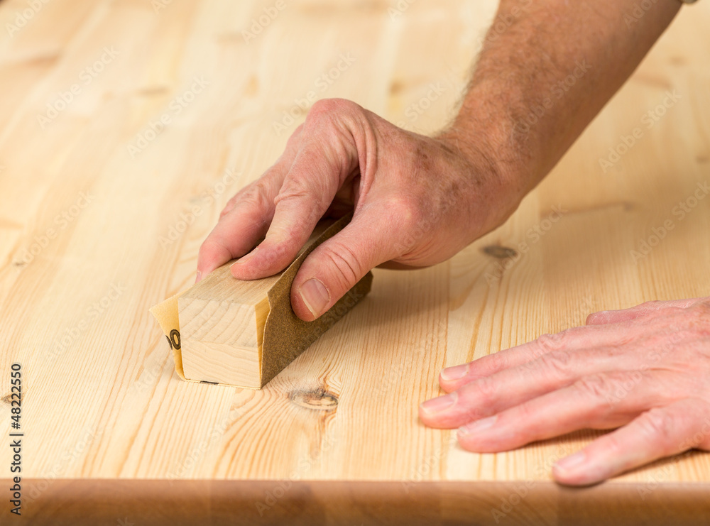 Mans hand on sanding block on pine wood