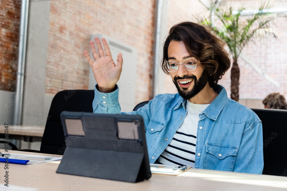 Smiling young caucasian man waving hello on a video call using a digital tablet in the office. Copy space.