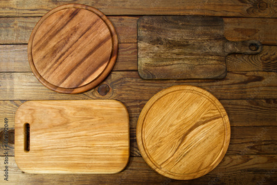 Pizza round wood cutting board mockup top view. Different types of kitchen boards on wooden background. Copy space on workspace tabletop. Thanksgiving day