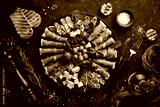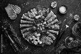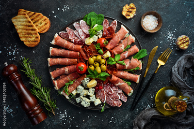 Italian prosciutto, dried pork, parmesan cheese, olives and snacks on a plate. Top view. On a gray stone background.
