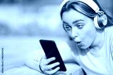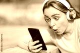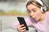 Surprised teenage girl checking phone audio content