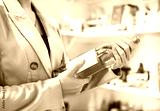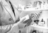 Closeup woman (in a beige color formal suit) holding bottle of white wine in hands with care on blurred background. People choosing a quality liquor for special occasion, party or celebration.