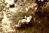 Woman reading a book in garden recliner chair. Summer vacation in the yard. Mature Scandinavian female life in retirement. Good living. View from the top. Beautiful middle aged woman resting