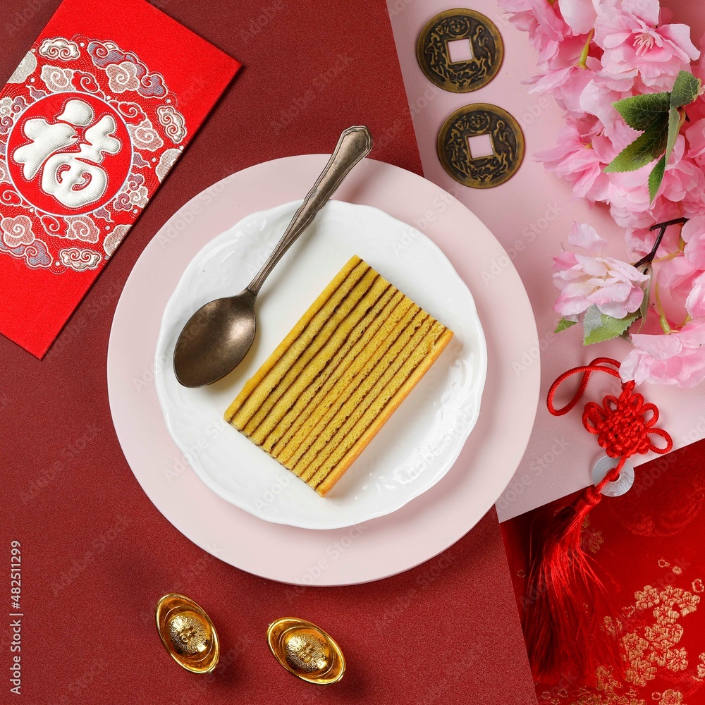 Lapis Legit, Indonesian Traditional Thousand Layered Cake with Chinese New Year Red Concept.