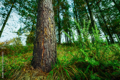 Commercial pine tree in the forest. Bottom view of pine tree trunk with amber resin on bark of pine tree. Pine plantation for timber. Tree and green grass in the forest. Source of turpentine.