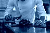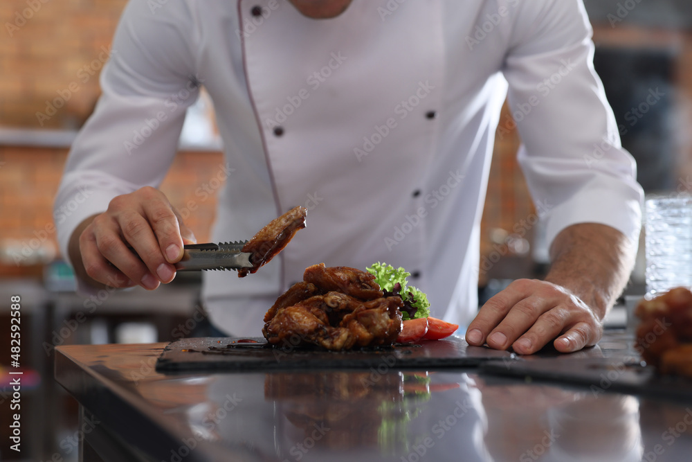 Professional chef with delicious fried chicken wings in restaurant kitchen, closeup