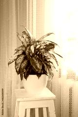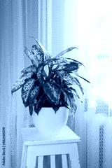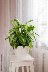 Tropical Dieffenbachia plant on a white stand in a room by the window. The concept of home floriculture.