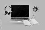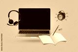Creative minimal composition made with a laptop, headphones, school supplies and alarm clock flying in the air. Back to school.