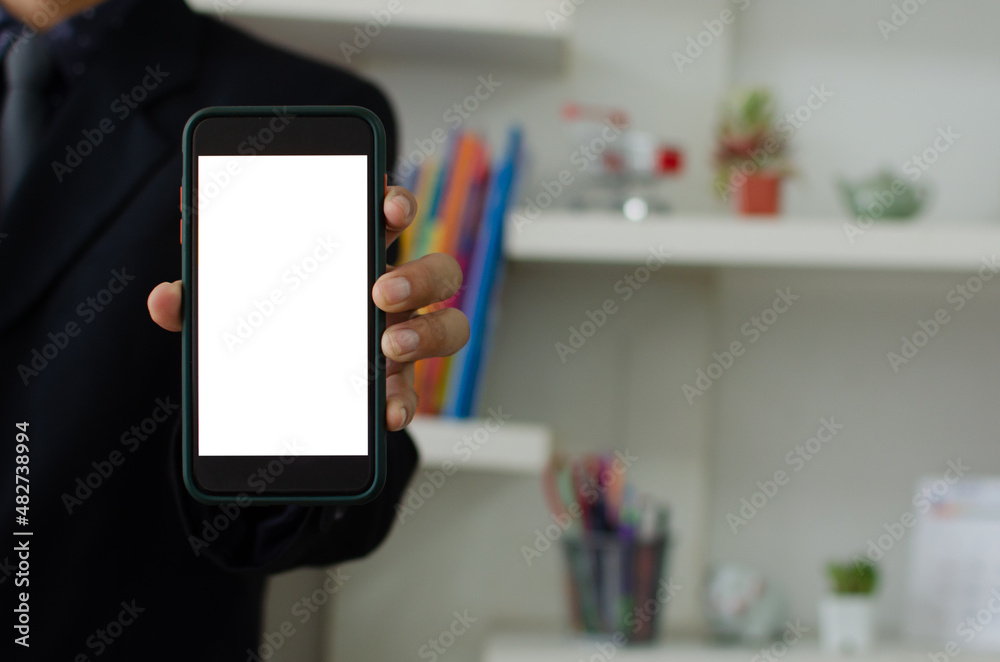 Mockup a mobile phone in the man hand. Blank screen with text or image for an advertisement.
