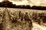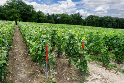 In the Champagne vineyards of Montagne de Reims, Reims, France, row vine grapes.