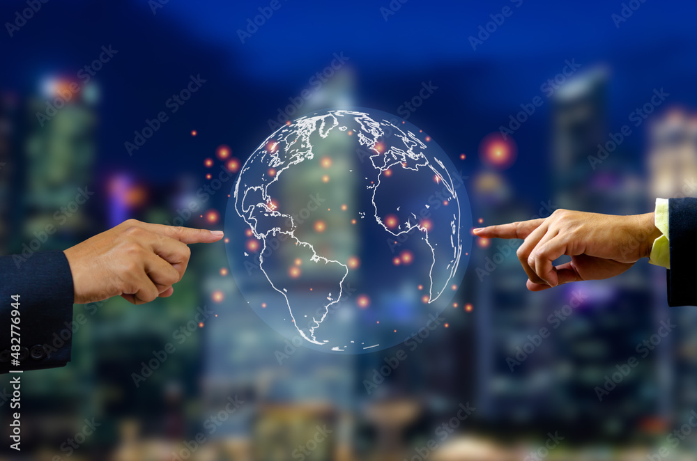 Businessman hand pointing to abstract world glow on blur blue background bokeh, innovation, global business concept.