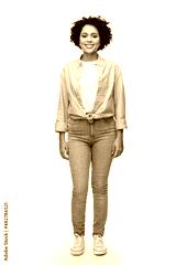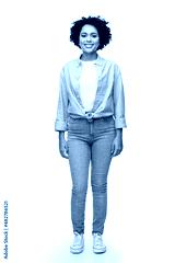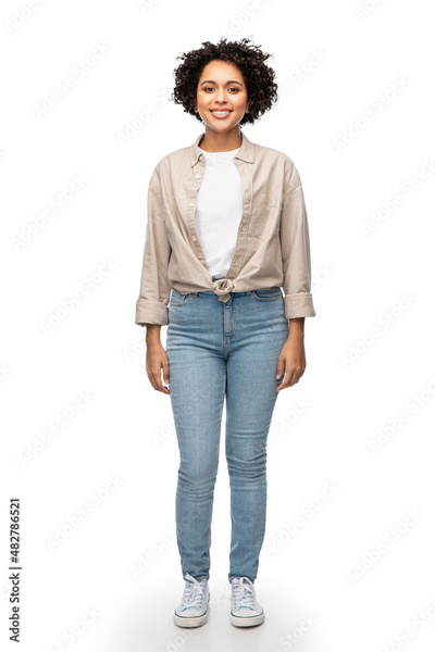 people, ethnicity and portrait concept - happy smiling woman in shirt and jeans over white background