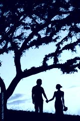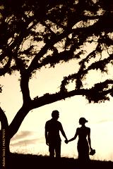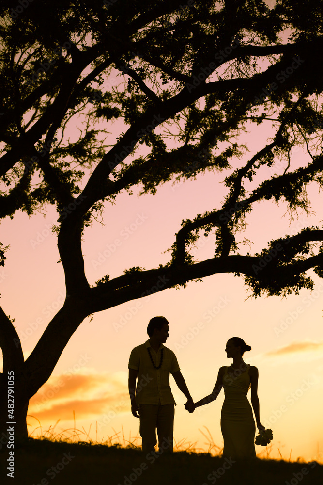 Silhouette of happy just married couple holding hand walking in the sunset