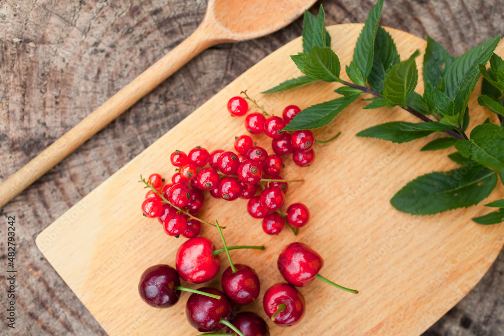 red currants, cherries on wooden cutting board background