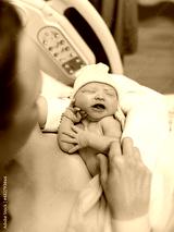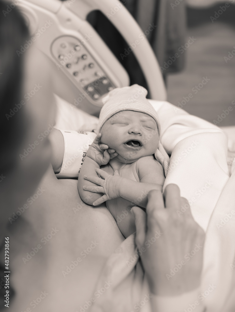 Mother holding new born baby in hospital bed after delivery