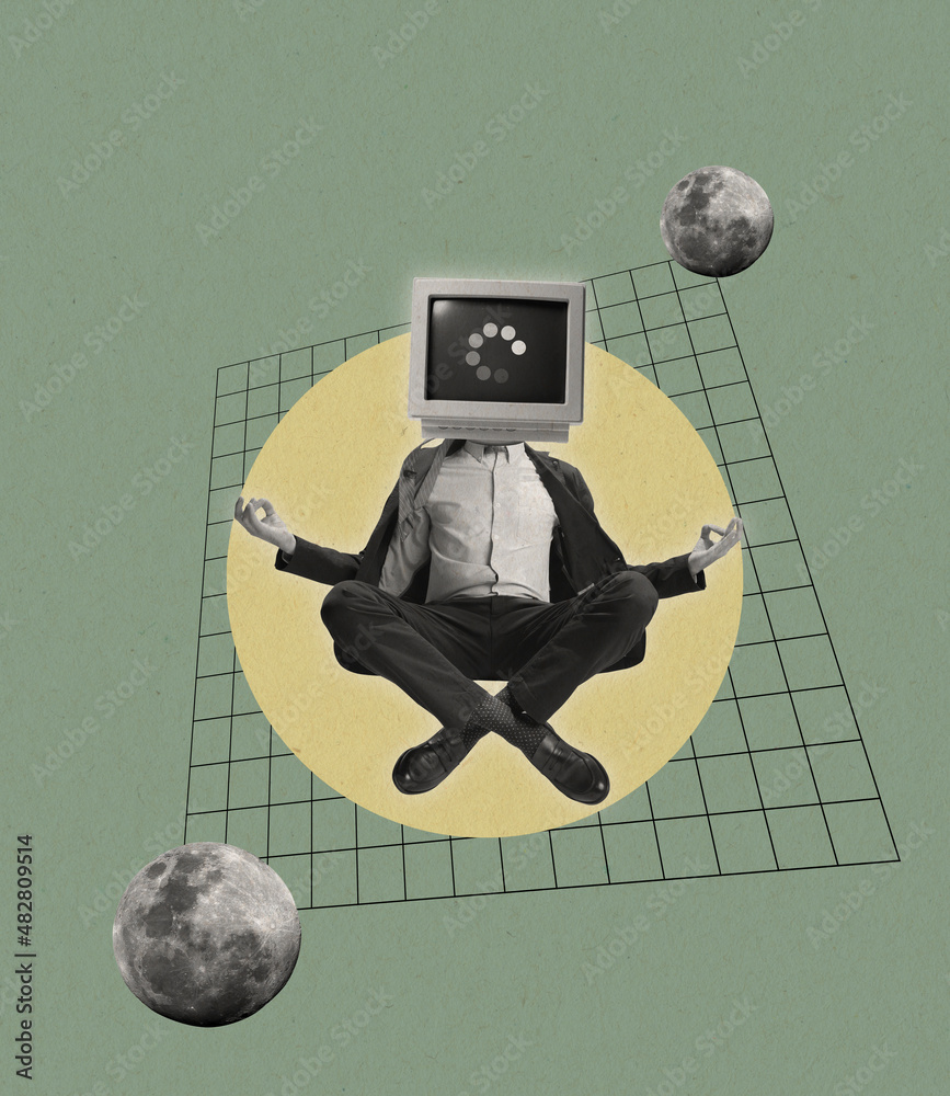 Contemporary art collage. Man, businessman in suit headed with retro computer sitting in yoga lotus pose isolated over abstract background