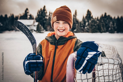 portrait of happy hockey player on a lake