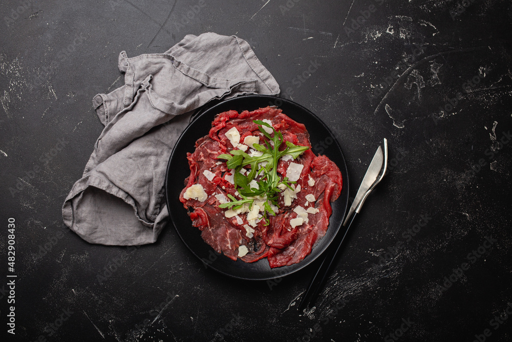 Italian cold meat appetizer Beef carpaccio with parmesan cheese and arugula on black plate with fork and knife on dark stone concrete rustic background flat lay from above