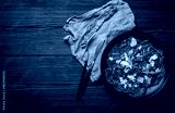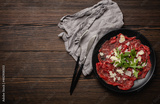 Italian cold meat appetizer Beef carpaccio with parmesan cheese and arugula on black plate with fork and knife on dark brown wooden rustic background flat lay from above space for text