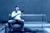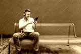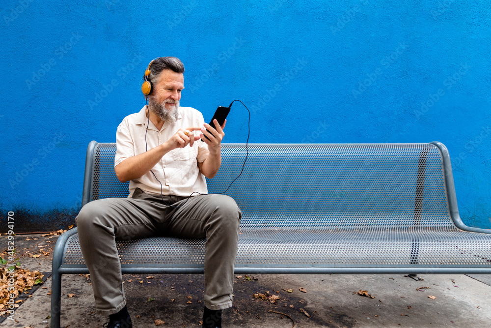 Mature caucasian man sit on a bench in public park using phone and listening to music with headphones. Copy space.