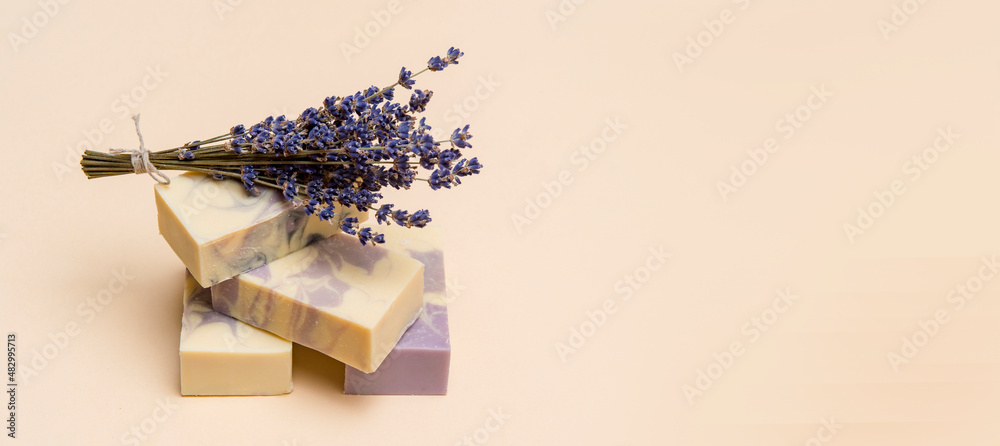 Natural handmade soap with dried lavender and essential oil on pink background. Zero waste concept