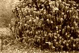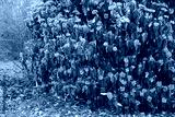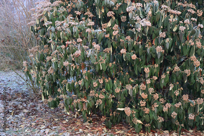 Viburnum rhytidophyllum tree covered with frost in the garden. Viburnum bush on winter season