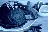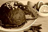 Cut Italian Zuccotto cake made with chocolate sponge cake ,chocolate and orange cream on plate on wooden table