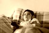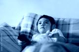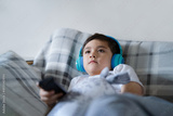 Portrait of happy child wearing headphones and looking up watching TV, Kid sitting on sofa holding remote control, Happy young boy listening to music relaxing in living room at home