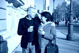 happy Caucasian couple strolling with a paper cup of coffee in each other's arms